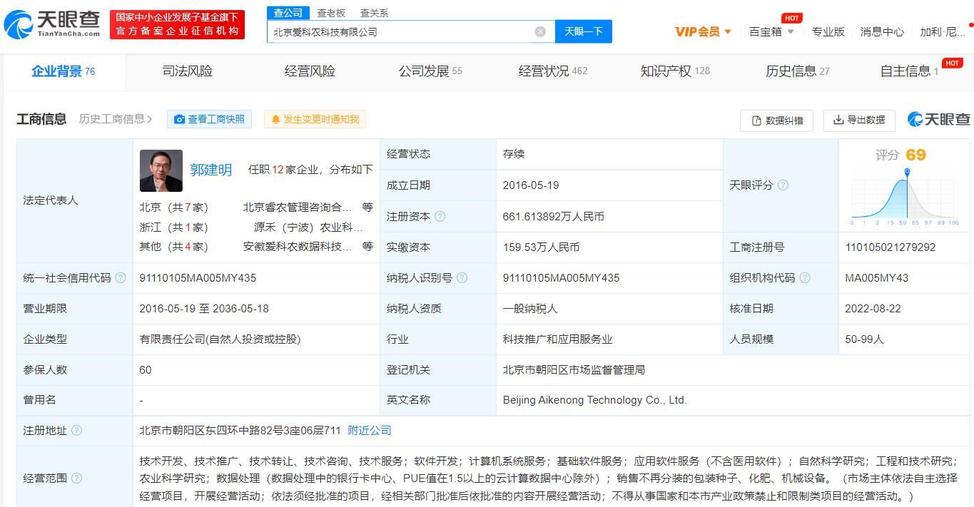 该公司成立于2016年5月,法定代表人郭建明,经营范围包括应用软件服务;自然科学研究;工程和技术研究;农业科学研究等。官网显示,爱科农是一家农作物智能种植决策服务商。