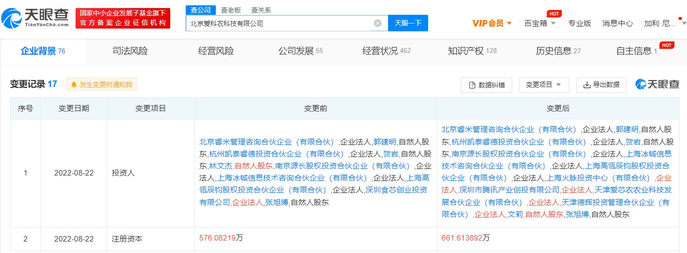 鞭牛士 8月24日消息,天眼查App显示,近日,北京爱科农科技有限公司发生工商变更,原股东深圳食芯创业投资有限公司等退出,新增股东深圳市腾讯产业创投有限公司等,同时注册资本由约576.08万人民币增至约661.61万人民币。