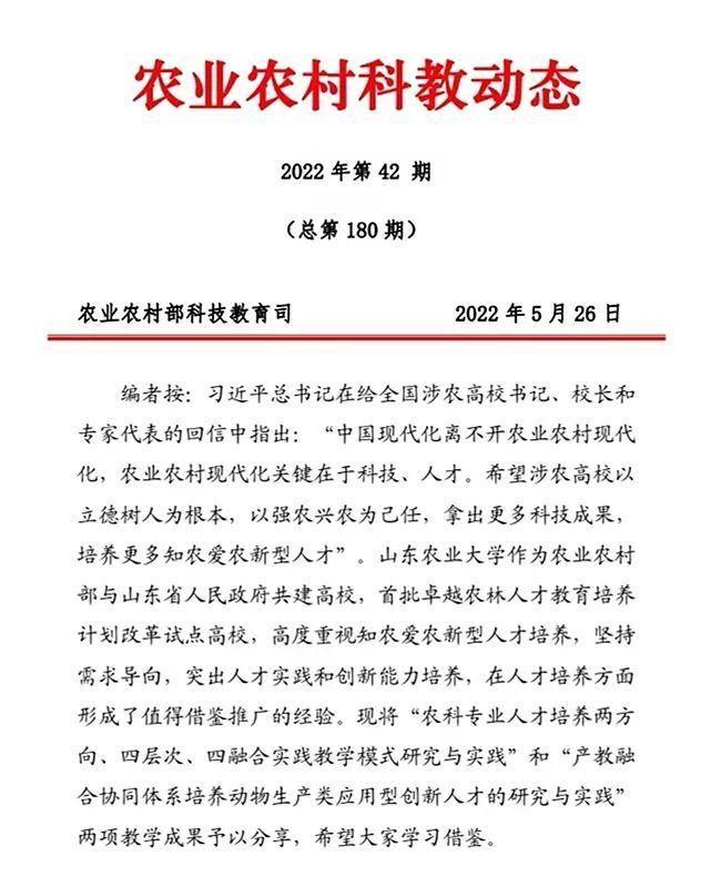 近日,《农业农村科教动态》专版刊发山东农业大学“农科专业人才培养两方向、四层次、四融合实践教学模式研究与实践”和“产教融合协同体系培养动物生产类应用型创新人才的研究与实践”两项教学成果,面向全国宣传推介育人新模式。